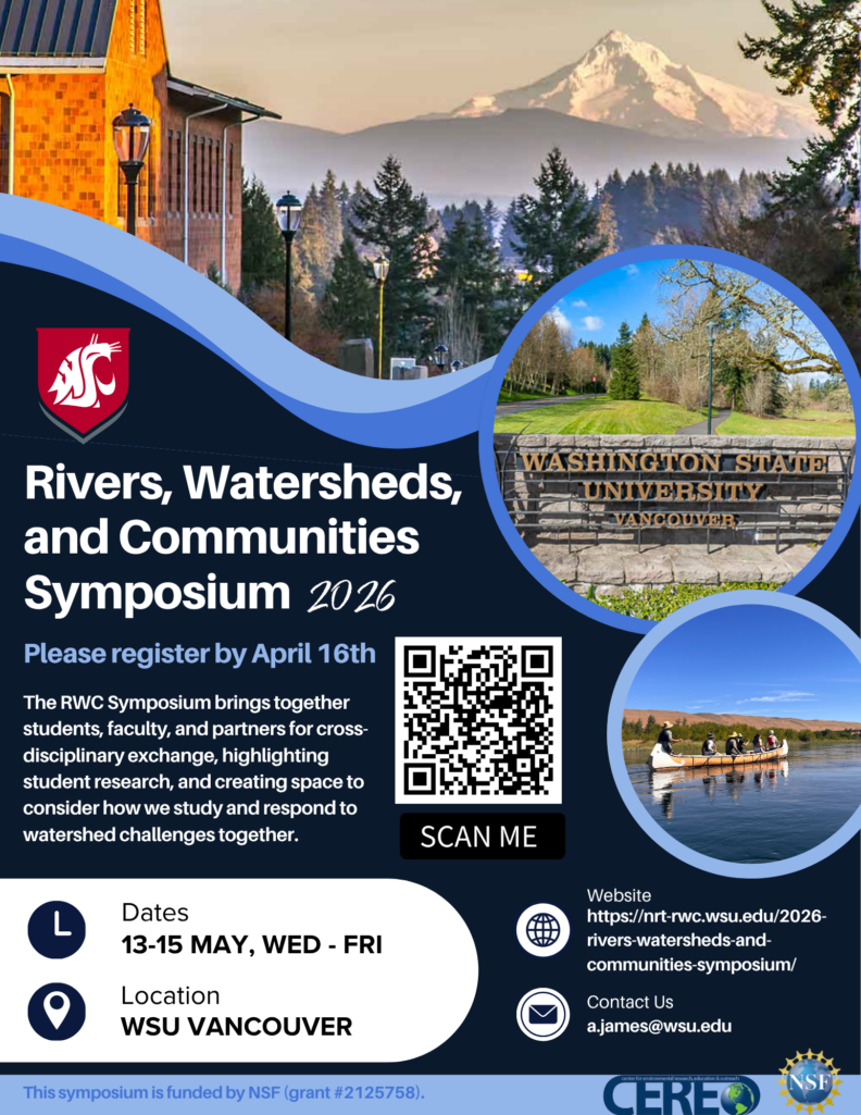 We are now in the 5th year of the program. With 28 graduate students and 25 faculty mentors, we have a lot to celebrate and reflect on over the past four years of the traineeship (NRT) and our work to develop meaningful partnerships with those working on or affected by water quality issues. In attendance will be invited WSU faculty, staff, students, and community partners, so that together we can reflect on the community engaged research experiences of WSU graduate students. We will continue to develop ideas about how to co-create research that addresses the wide range of ecosystem and human health issues in the Columbia River Basin.